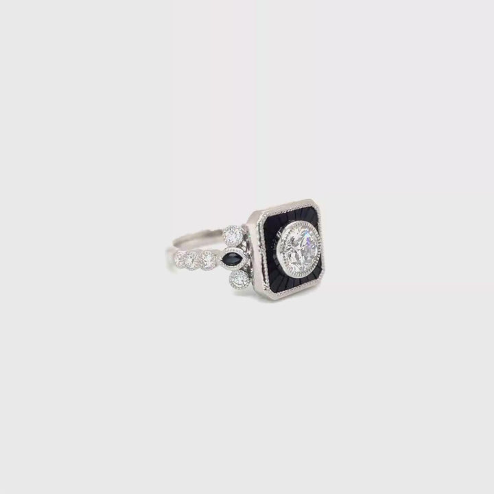 Surrounding the centre stone is a striking arrangement of faceted black onyx and marquise-shaped onyx, creating architectural depth and refined contrast. Adding further brilliance, 10 round brilliant cut lab-grown diamonds (E colour, VS clarity) are delicately bezel set along the band, totalling 0.30ct. Intricate milgrain detailing frames the design, introducing vintage-inspired texture and elevating the craftsmanship.